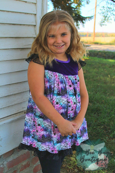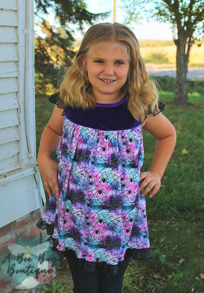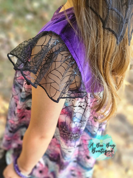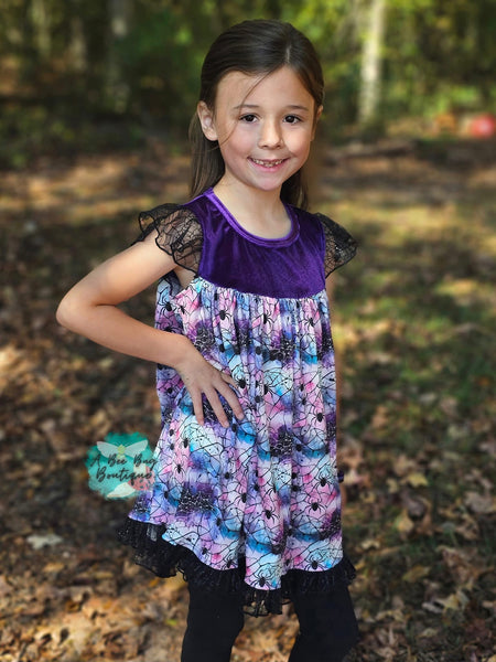 The most gorgeous spiderwebbed pattern on an embellished milk silk tunic top! This is gorgeous in person with the tulle details and soft crushed purple velvet!